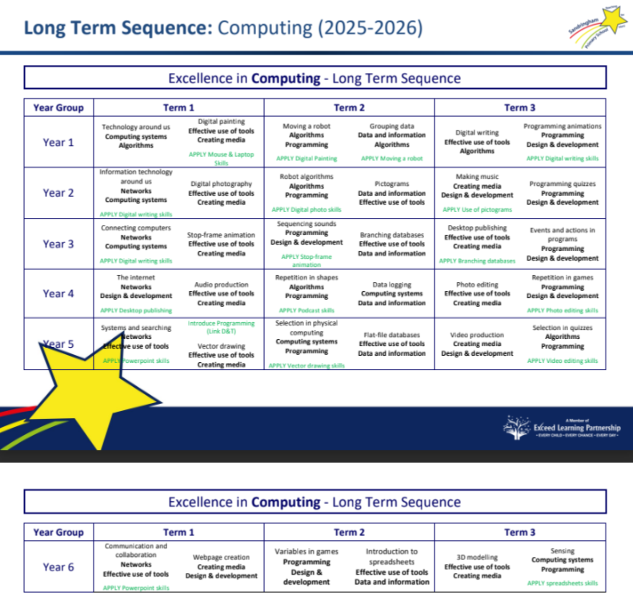 This document outlines the knowledge, language and concepts that should be taught in Computing. It includes: • A summary of the Computing knowledge and principles that underpin our approach • Long Term Sequence (curriculum map) for Computing • Progression of Computing including alignment with the National Curriculum, substantive concepts, big ideas and questions as well as Tier 2 and Tier 3 vocabulary It is influenced by documents and research, including https://www.gov.uk/government/publications/research-review-series-computing/research-review-series-computing and the National Centre for Computing Education’s computing taxonomy.