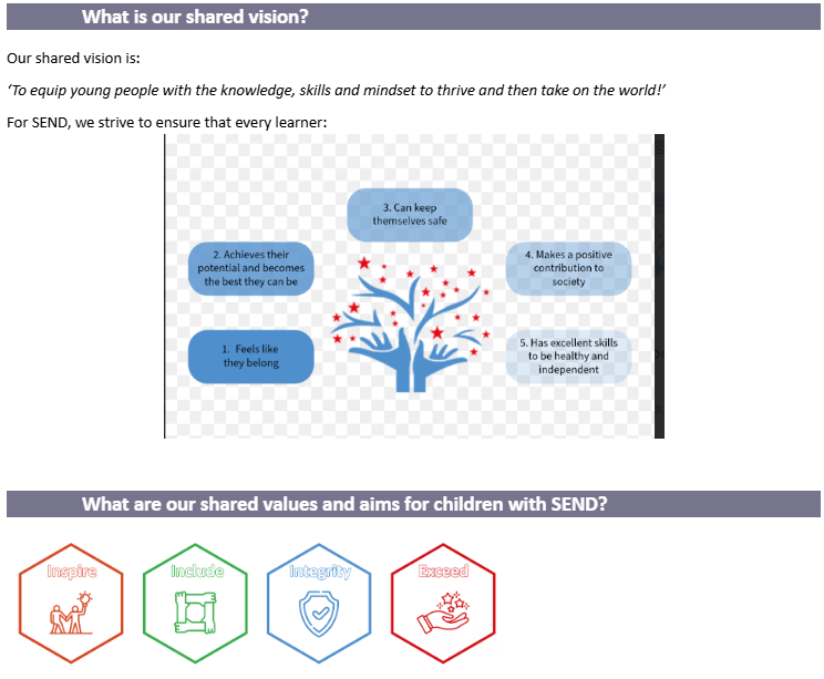 Our SEND values link directly to each aspect of our Trust values. However this is mostly relevant for ‘Include’. We are concerned about achieving equitable, diverse and quality education for all pupils.